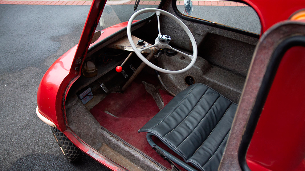 El Peel P50, uno de los autos más pequeños del mundo, no solo se destacó por su diminuto tamaño, sino también por su inusual sistema de dirección. En lugar de un volante tradicional, utilizaba una barra con una perilla tipo joystick o bola que giraba hacia los lados. Con un diseño que parecía más de carrito de golf que de automóvil urbano, este volante sigue siendo un ícono del diseño minimalista y excéntrico.